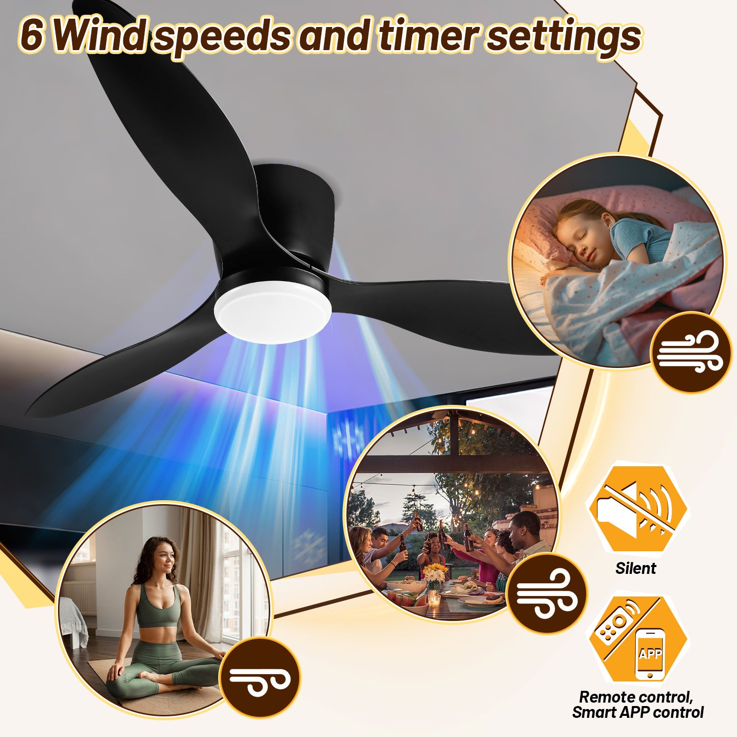 Easy Installation: Ceiling fans with Lights have explicit installation instructions and precautions in the package. It will help you complete it quickly. There are 6 wind speeds to choose from for different needs.Timer Function(/2/4/8 hours)